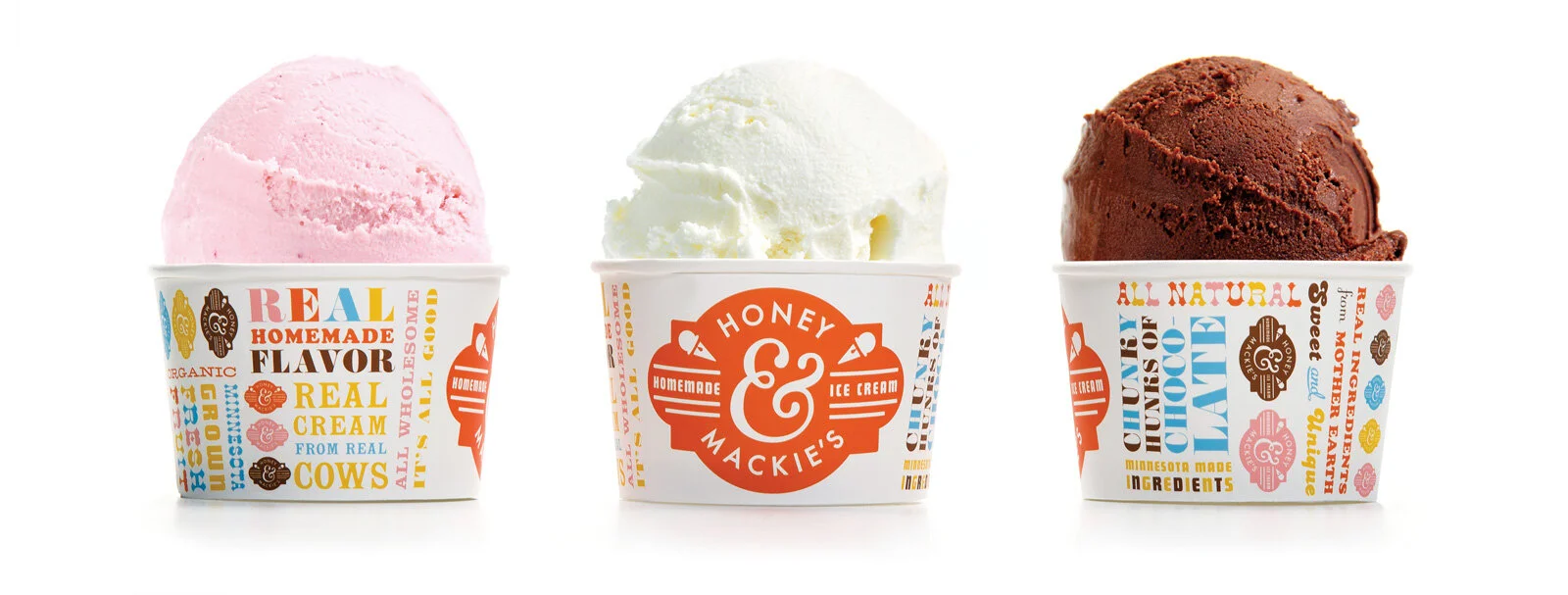 “ Honey & Mackie’s is an ice cream shop for kids that caters to parents. The name of the establishment comes from the nicknames of the owners’ children. Thus, the branding and packaging needed to be modern, authentic and kid fun. Additionally, all of their ingredients are all-natural, organic and locally grown.'“