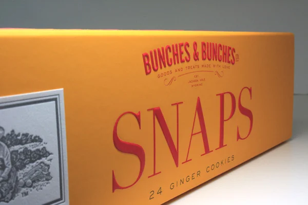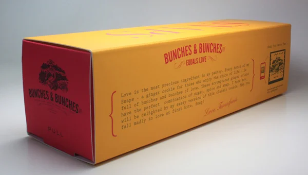 /Miller Brand Agency created a unique structure and package design for gourmet ginger snap cookies, Bunches & Bunches Snaps. Miller placed careful consideration on color, print finish and packaging construction, while respecting the client’s wishes for a package that had its own unique identity, but still felt on-brand.
