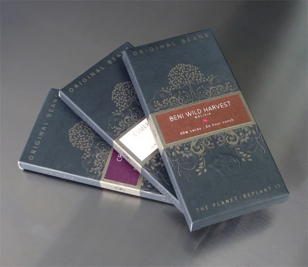 /Packaging for Original Beans designed by the Department of Graphic Sciences:Each Original Beans bar contains a lot number, which designates the location of a new tree so that you can track your contribution.” The packaging, produced in a facility that uses 100% wind power, is an elegant complement to this premise. Instead of the usual plastiquey chocolate wrapper, Original Beans come in a toothy, tactile, custom-made batch of French Paper, adding an earthy quality to the experience.