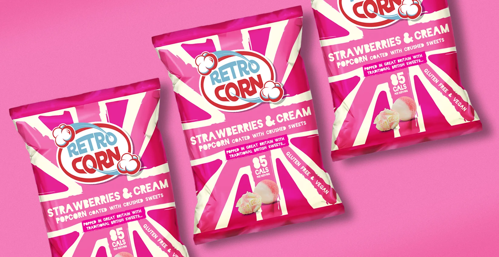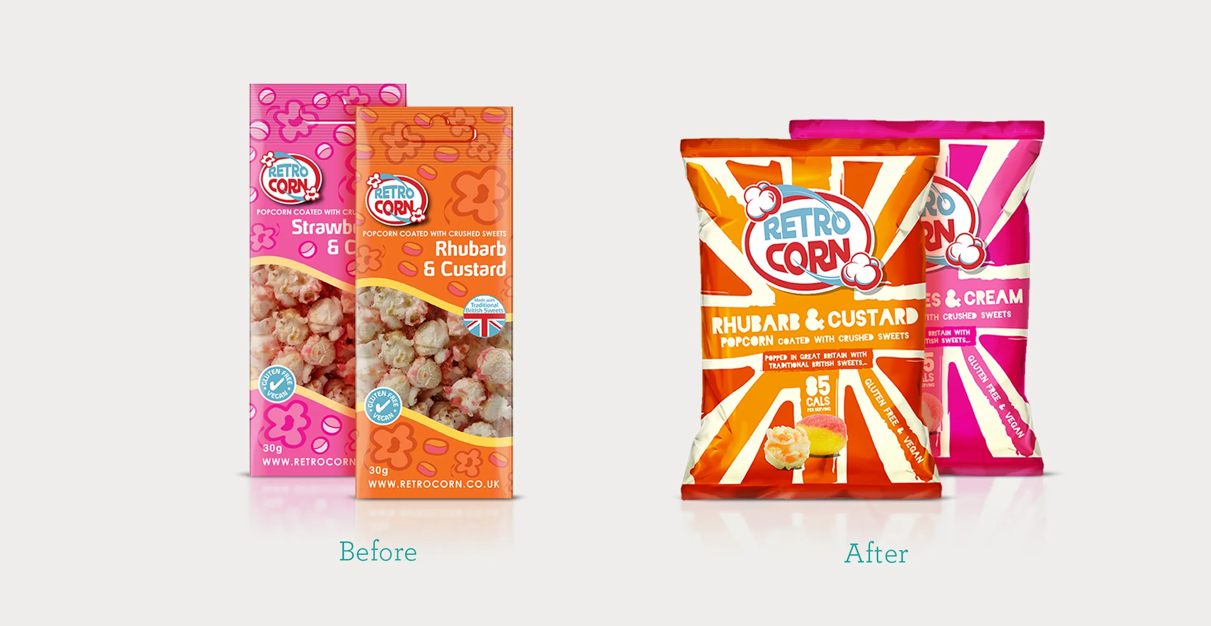 You can’t move for popcorn brands these days; In fact there’s no shortage of popcorn brands that mostly taste and look just the same. Very few indeed, in a crowded sector, have the character and originality to genuinely stand out from the crowd.However, RetroCorn, who began producing small batches of its tasty all-natural, gluten-free, vegan popcorn in Essex in 2012, were already well ahead of the game; Each batch is gently hand-popped, and using their own secret technique, coated with crushed classic sweetshop sweets [Candyshop hard-candies] ; Cola Cubes, Strawberries & Cream, Rhubarb & Custard, Lemon & Lime Sherbet and Cherry Pips.The brand is distributed through Farm Shops, Delis and retailers including The Co-op and Mr Simm’s; They were the Official celebrity goody-bag snack of both the 2016 Brit Awards and the 2016 Rock Awards, and have produced bespoke flavours for the Radissonblu Hotel Group, Elemis and a special "Brain flavour" in conjunction with NOW TV’s release of "The Walking Dead". Despite all this, purchase frequency wasn’t as high as they’d like - and that, clearly, had to be addressed.BriefThe popcorn category has experienced recent huge growth, with myriad new opportunities in usage occasion - so RetroCorn needed to stay one step ahead of the competition. After tasting RetroCorn Popcorn we were genuinely amazed. The quality is outstanding - with truly original, classic and unforgettable flavours, so it was clear that we needed to create packaging with equal impact that was classic yet edgy; fun, but different. We were briefed to reinvent the brand in a modern and relevant way whilst being respectful that at the heart of the RetroCorn brand are the traditional British Sweetshop Sweets of Old, which is integral to the individuality of the product.ApproachThe key to getting them noticed was to ensure the design re-injected the spirit of, and clearly communicated, the "Britishness" of the product in order to attract both nostalgic grown-ups and recruit real foodies, without resorting to the cliché'd bucket and spade/end-of-the-pier gift-shop look.Inspired by both the spirit and the aesthetic of the Punk movement, classic British irreverence and freedom-of-expression-without-reprisal - a smidgin unconventional for the popcorn category - whilst taking cues from other relevant categories such as sweets and crisps [Candy and Chips] we developed a system of bold, confident colour combinations - a palette that shouted loud and proud about the brand's unmistakably eccentric, inventive and slightly bonkers British origins. Together with using a bold Union Jack motif as a stamp of quality and provenance, with these bright unconventional colourways - to differentiate the flavours - and confident, anarchic punk typography -combined with great product photography - we were able to emphasise the amazing ingredients and eccentric and innovative nature of the product.This kind of nuttiness wouldn't happen in, for example, Germany; who've only recently graduated from having just two flavours of crisps - Kartoffel and Paprika; or Norway, where Plain and With Salt, it would seem, are the only popcorn flavours permissible. Like a lot of other world-changing British inventions the genesis of RetroCorn may have begun with a simple but crazy idea. However, this essentially British brand of innovation exemplifies a propensity for playful inventiveness, a special British kind of "Bonkers".ResultsThe new design clearly differentiates itself from the competition through its bright and original and provocatively punk aesthetic. However - most of all, the design gets rid of any dated preconceptions that popcorn packaging must follow a certain look, what we like to call the "red plush and cinema lighting aesthetic" - and instead creates a new enticing brand - rich with British flavour, offering consumers a distinctive, iconic, modern, and crucially- different - product. Working to a tight deadline, we enabled RetroCorn owner Greg Taylor to transform his imaginative and original product into a genuinely standout brand.New-look RetroCorn Popcorn was released in April and they’re already beginning to go down a storm; achieving first-time listings in new UK supermarkets, and stores internationally, within it’s first week of relaunch. Since then, we’ve applied the system to a wide range of in-store materials, from Posters to FSDU’s and an array of communications, including literature and ads – all infused with the new vibrantly visual and verbal flavours of RetroCorn.What the client saysRetrocorn is absolutely delighted with the work that Quite Storm Design did on the re-branding. Retrocorn now has a really strong new identity that promotes its inherent Britishness and its unique selling points. The new designs have allowed us to reach new customers at home and further afield in Europe, The Middle-East and China, and make us instantly recognisable on the crowded popcorn shelves in stores across the UK. We are really excited about our future and look forward to working closely them again on new products for new markets.