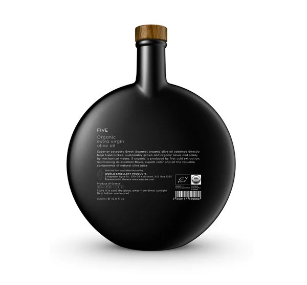 This brand identity and packaging design for a new premium quality series of Greek extra virgin olive oil. 5 olive oil stands for quintessence in olive oil.